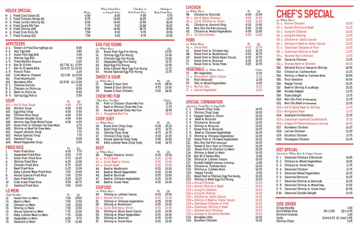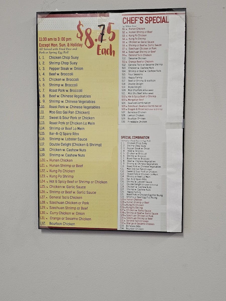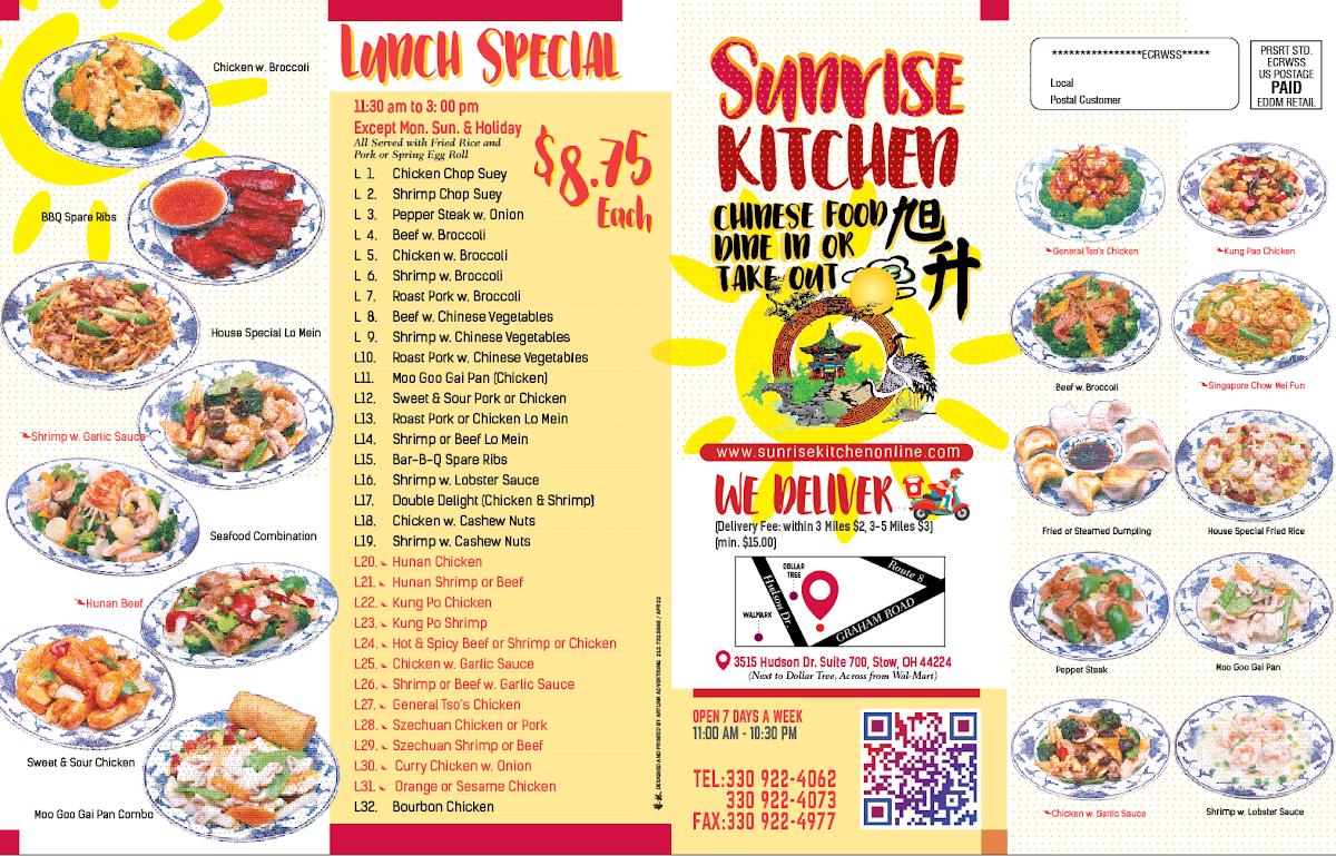 The menu at Sunrise Kitchen offers a wide variety of dishes, catering to all tastes and dietary preferences. For those looking for lighter options, the Steamed Chicken & Broccoli and Steamed Chicken with Mixed Vegs are excellent choices. The Dinner Special Combinations include popular items like Chicken Chop Suey and Shrimp Chop Suey, as well as comforting dishes like Roast Pork Lo Mein and Chicken Lo Mein. The Fried Rice selection features everything from Vegetable Fried Rice to Beef Fried Rice and Shrimp Fried Rice, offering something for everyone. If you prefer pork, you can enjoy dishes such as Hunan Pork or Roast Pork with Snow Peas. The Chop Suey options, including Roast Pork Chop Suey and Beef Chop Suey, are perfect for a hearty meal. The Lunch Special Menu offers a variety of dishes like Pepper Steak with Onion and Chicken with Broccoli, along with a flavorful Shrimp Chow Mei Fun. For appetizers, you can choose from Chicken Egg Roll, Steam Dumplings, or Vegetable Roll, among others. Seafood lovers will appreciate options such as Hunan Shrimp and Shrimp with Black Bean Sauce. For sides, there's Crispy Noodle, Extra White Rice, or Shrimp Chips. Vegetarians can opt for the General Tso's Tofu or Szechuan Tofu, and there's a variety of soups like Hot & Sour Soup and Wonton Soup to complement any meal. Overall, Sunrise Kitchen's menu is extensive and diverse, providing something for every palate, whether you're in the mood for seafood, stir-fry, or vegetarian dishes.